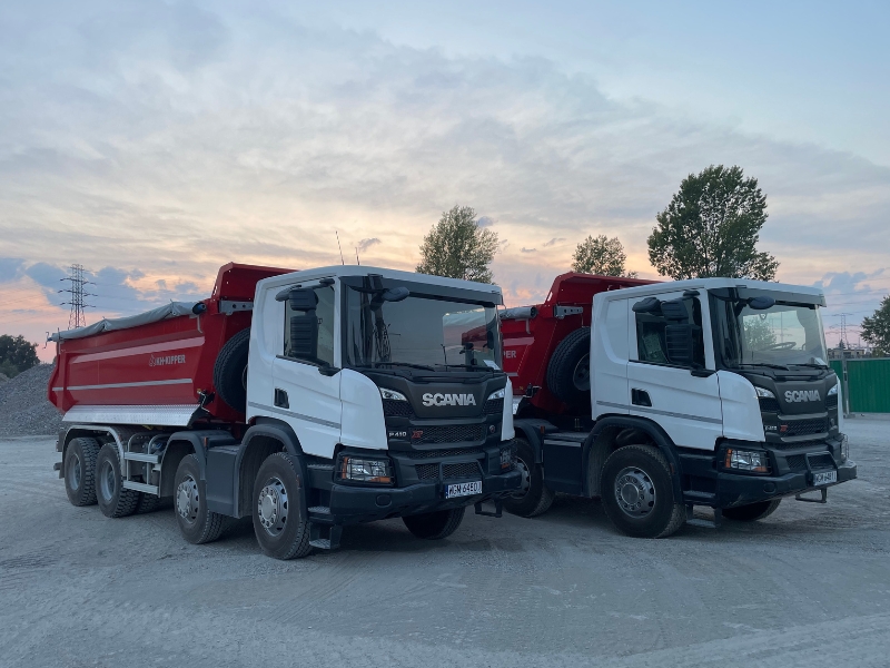 - Ciągniki siodłowe wraz z naczepami i wywrotki 4-osiowe, które pozwalają transportować materiały sypkie tzn. piasek, kruszywa.